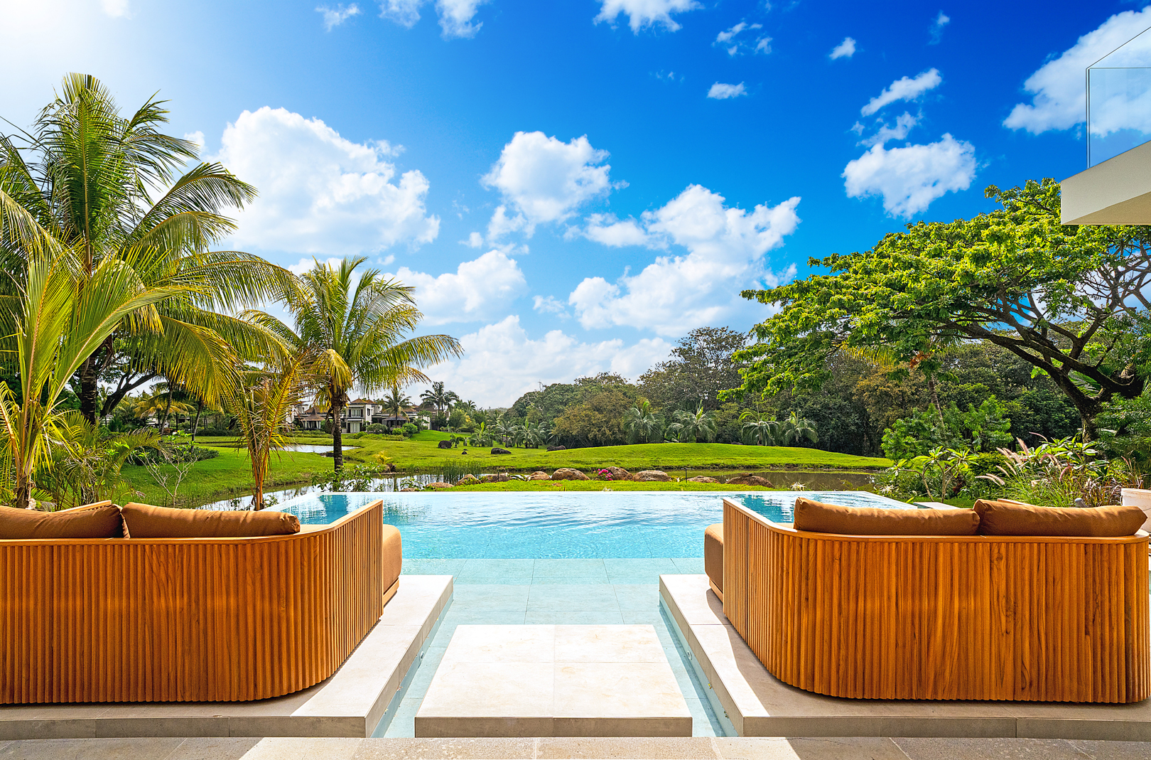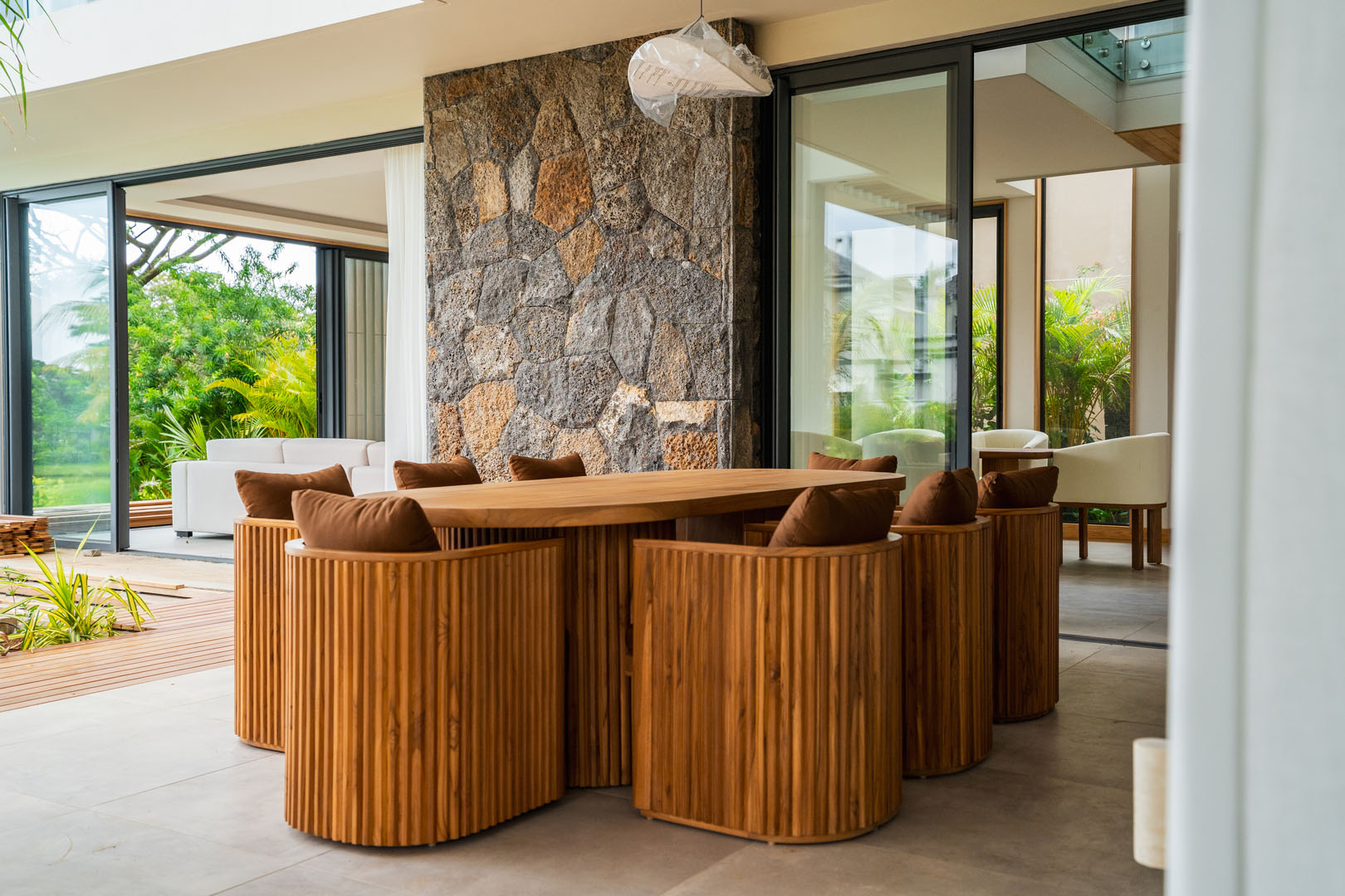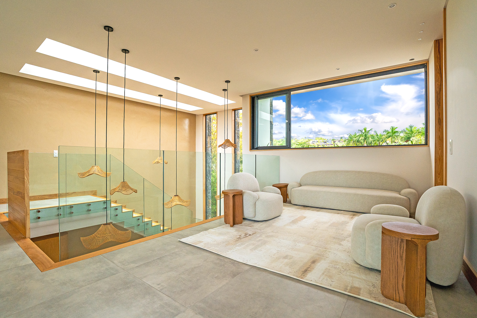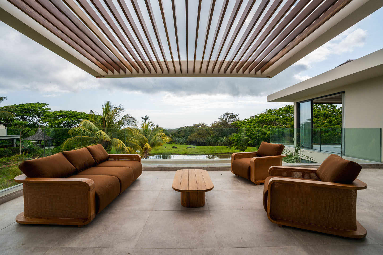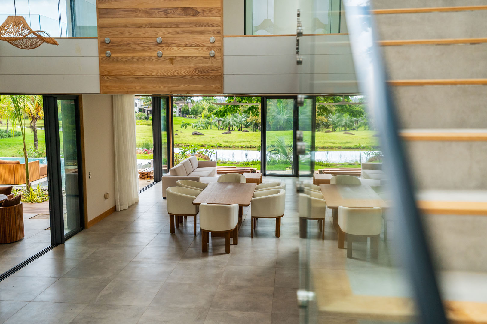 Les grandes baies vitrées invitent le paysage à entrer, révélant le lac, les jardins naturels et la douceur du climat tropical. Les espaces de vie s’organisent autour de volumes généreux où chaque perspective a été pensée pour offrir une sensation d’espace et de quiétude.