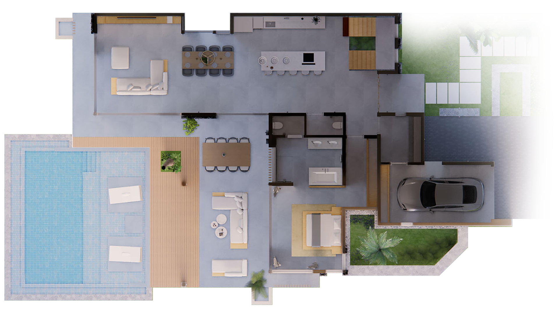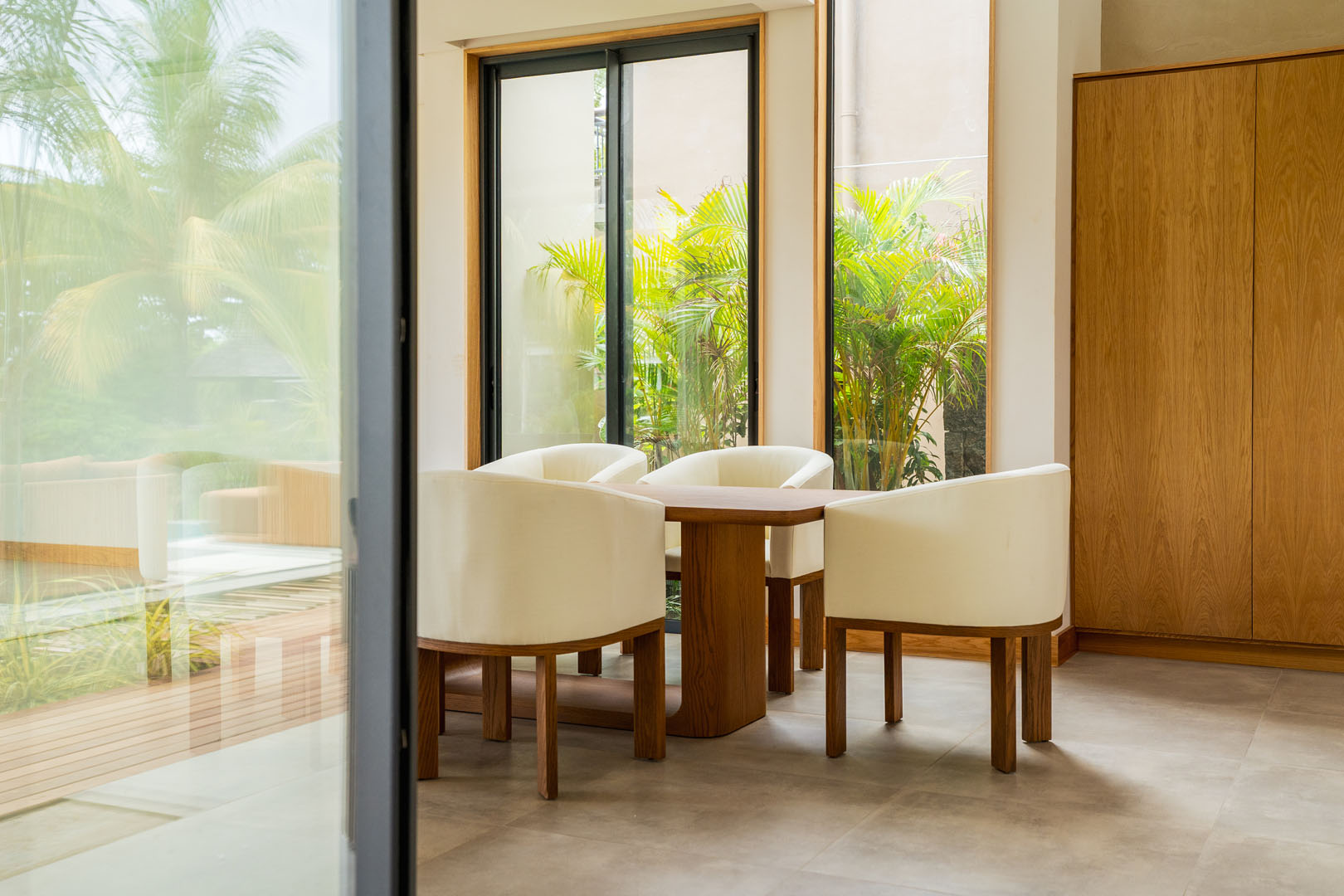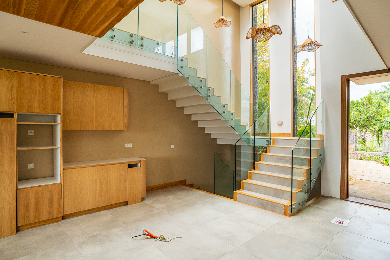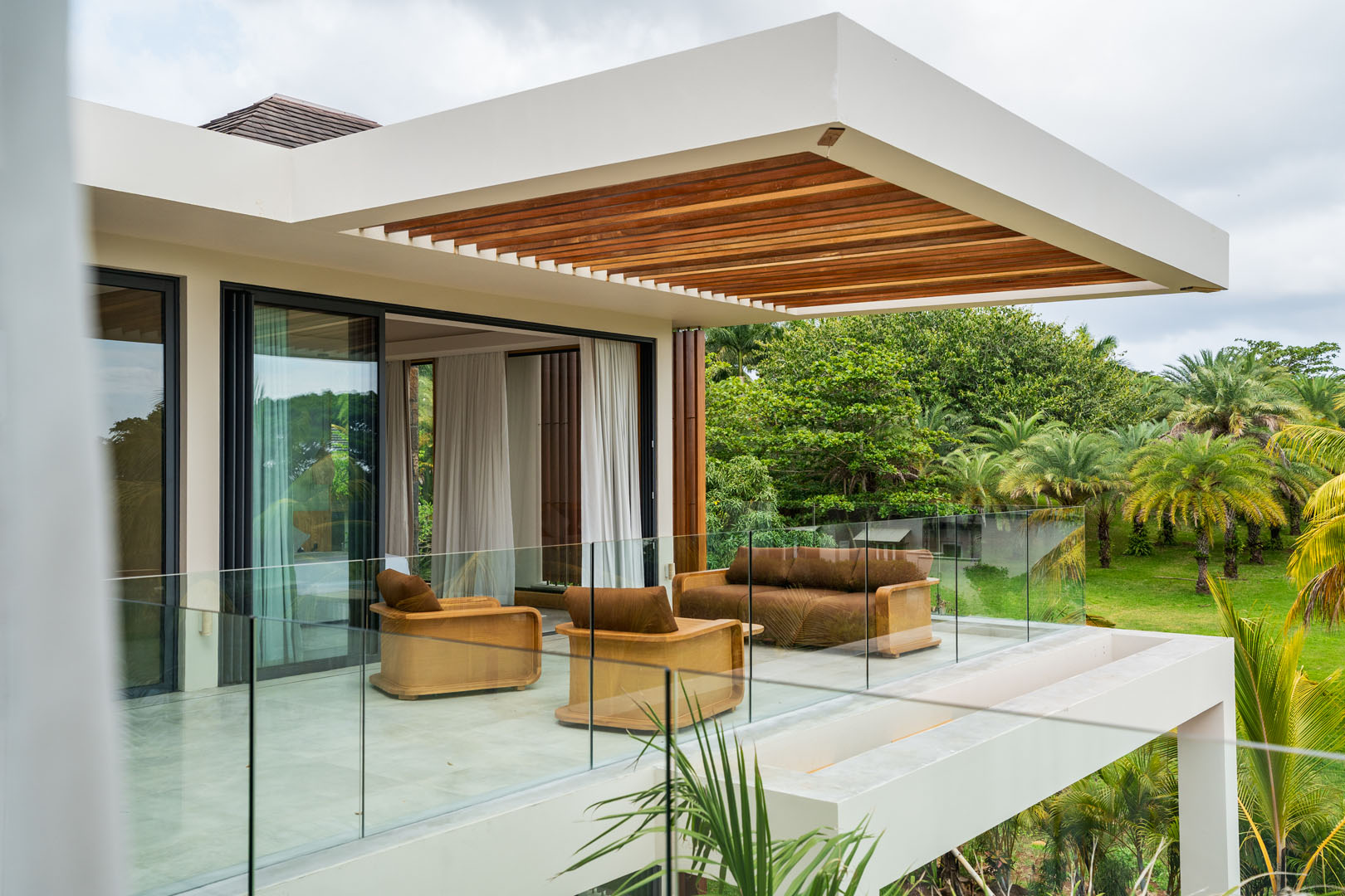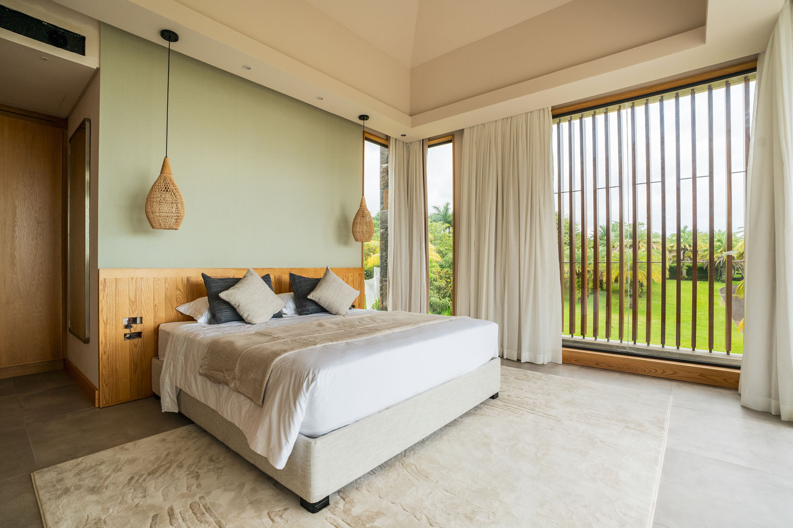 Les grandes baies vitrées invitent le paysage à entrer, révélant le lac, les jardins naturels et la douceur du climat tropical. Les espaces de vie s’organisent autour de volumes généreux où chaque perspective a été pensée pour offrir une sensation d’espace et de quiétude.